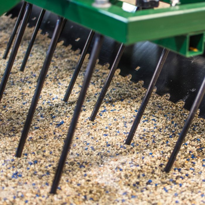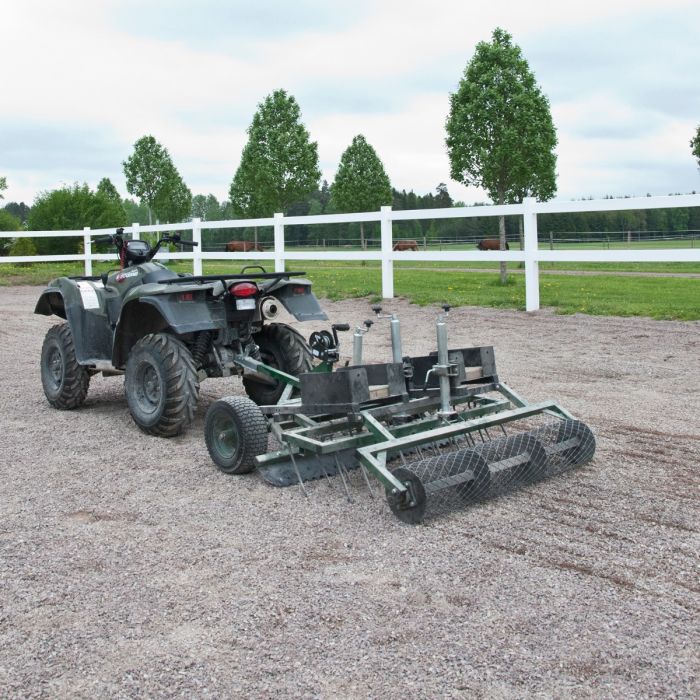 Der Reitbahnplaner ist mit drei Geräten ausgestattet: das Crossboard eignet sich zum Einebnen größerer Vertiefungen besser als die ausschließliche Verwendung von Zinken; 2 Reihen Nivellierzinken sorgen für gründliches Eggen nach dem Crossboard-Einsatz, und eine Gitterwalze übernimmt das abschließende Glattziehen.