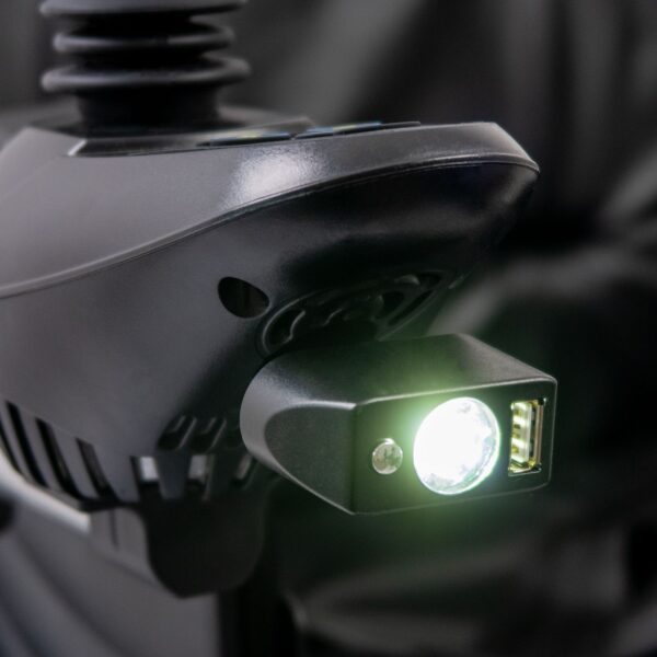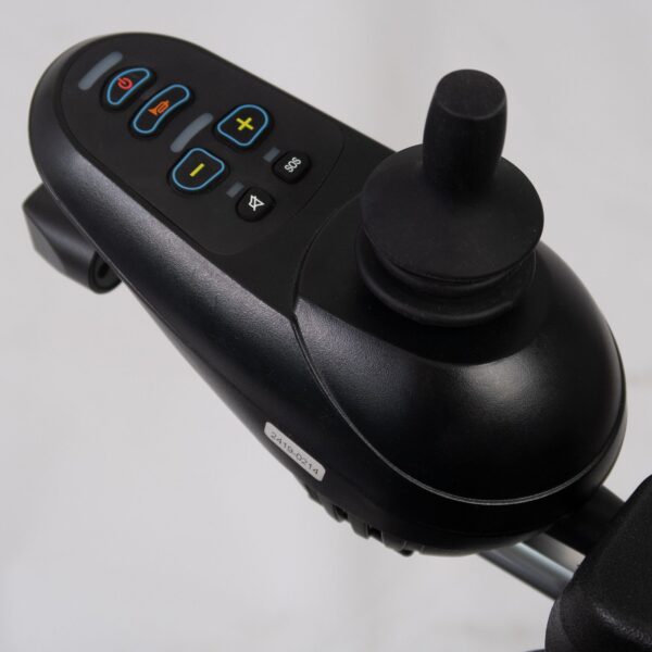 Die Steuerung des Elektrorollstuhls erfolgt über ein 360°-Joystick, das sowohl links als auch rechts angebracht werden kann. Auf der Steuertafel sehen Sie zudem den Ladezustand und die gewählte Geschwindigkeitsstufe, die sich mittels +/- Tasten leicht einstellen lässt.