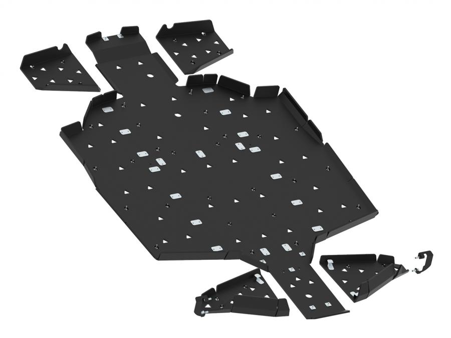 Das Unterfahrschutz-Kit besteht aus den Hauptunterfahrschutzteilen (Kunststoff), den Armschützern (Kunststoff) und den vorderen Bremssattelschützern (Aluminiumlegierung).